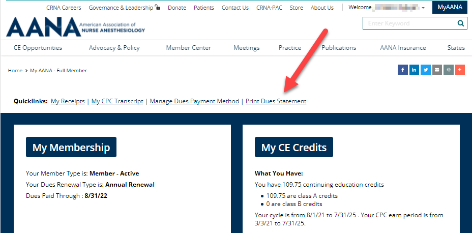 Go to aana.com/login and log in with your User ID and password. Once your signed in, you will automatically be taken to your My AANA page. Click on Print Dues Statement link: